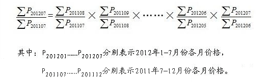 3、同比價格指數(shù)的計算方法。由于部分城市用以計算同比價格指數(shù)的基期網(wǎng)簽數(shù)據(jù)缺失,故不能計算2012年10月前各月與網(wǎng)簽數(shù)據(jù)同一口徑的同比價格指數(shù)。為保持同比價格指數(shù)計算和發(fā)布的連續(xù)性和穩(wěn)定性,滿足有關方面的需要,國家統(tǒng)計局采用有關房價統(tǒng)計數(shù)據(jù)和按網(wǎng)簽數(shù)據(jù)計算的房價數(shù)據(jù),根據(jù)同比指數(shù)和環(huán)比指數(shù)之間的數(shù)學關系,對7月份同比價格指數(shù)的計算進行了技術(shù)處理:將2011年8—12月的環(huán)比數(shù)據(jù)連乘再乘以今年1—7月的環(huán)比數(shù)據(jù)生成本月同比價格指數(shù)。以此類推可計算其他月份的同比價格指數(shù)。計算公式表示為: