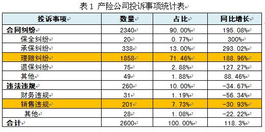2012年上半年,消費(fèi)者投訴事項(xiàng)涉及產(chǎn)險(xiǎn)公司的共有2600個(gè),同比增長(zhǎng)118.3%。其中,合同糾紛類投訴2340個(gè),占90%,同比增長(zhǎng)195.08%;違法違規(guī)類投訴260個(gè),占10%,同比下降34.67%。