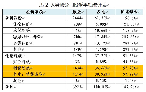 (三)人身險(xiǎn)公司投訴中違法違規(guī)類、合同糾紛類投訴均有較大幅度的增長(zhǎng),銷售誤導(dǎo)投訴仍居高不下