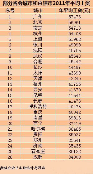 據(jù)國家統(tǒng)計局公布的數(shù)據(jù)顯示,2011年全國城鎮(zhèn)非私營單位在崗職工年平均工資為42452元。中新網(wǎng)財經(jīng)頻道統(tǒng)計發(fā)現(xiàn),同全國年平均工資水平42452元相比,廣州、北京、南京、杭州、上海、銀川、沈陽、武漢、合肥、長沙、太原這11個城市超過了全國平均水平。