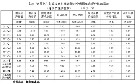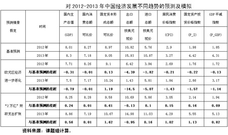 1、在各種預測及模擬情況下,經(jīng)濟增長率的最低預測值為7.5%。說明中國經(jīng)濟增長“降中趨穩(wěn)”的態(tài)勢正在確立。盡管由于歐元區(qū)經(jīng)濟衰退的沖擊,將增大短期內(nèi)中國經(jīng)濟增長率進一步下滑的壓力,但是,適當?shù)暮暧^調(diào)控政策將使中國經(jīng)濟不會出現(xiàn)大幅度下滑。7.5%的增速是近期可以實現(xiàn)的低線。另一方面,即使為提高增長而出臺“2萬億”的投資刺激計劃,經(jīng)濟增速也僅能拉升到8.25%(2012年)和8.86%(2013年)的水平,高低區(qū)間不過0.5-0.6個百分點。