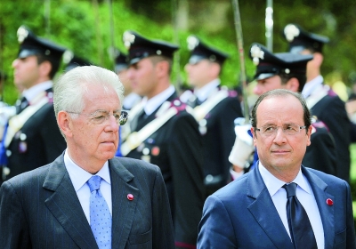 9月4日,在意大利首都羅馬的瑪達(dá)馬別墅,意大利總理蒙蒂(左)歡迎到訪的法國(guó)總統(tǒng)奧朗德(右)。