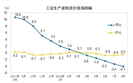 2012年8月份,全國工業(yè)生產者出廠價格同比下降3.5%,環(huán)比下降0.5%。工業(yè)生產者購進價格同比下降4.1%,環(huán)比下降0.5%。1—8月平均,工業(yè)生產者出廠價格同比下降1.3%,工業(yè)生產者購進價格同比下降1.2%。