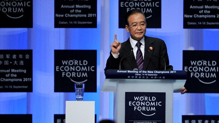 2012夏季達(dá)沃斯論壇于2012年9月11日至13日在天津市梅江會展中心舉行,國務(wù)院總理溫家寶將出席開幕式并發(fā)表主題致辭,預(yù)計全球?qū)⒂谐^2000名政要以及各行業(yè)精英將出席本屆論壇。圖為2011年9月14日第五屆夏季達(dá)沃斯論壇在大連舉行時,溫家寶總理出席開幕式并做致辭。