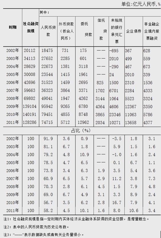 金融結(jié)構(gòu)呈現(xiàn)多元發(fā)展,金融對(duì)資源配置的積極作用不斷提高。一是人民幣貸款占比顯著下降,人民幣貸款外的其他方式融資數(shù)量和占比明顯上升。2011年新增人民幣貸款7.47萬億元,是2002年的4.04倍;除人民幣貸款外的其他方式融資為5.36萬億元,是2002年的32.7倍,占同期社會(huì)融資規(guī)模的41.8%,比2002年上升33.7個(gè)百分點(diǎn)。二是直接融資快速發(fā)展,市場(chǎng)配置資金的作用不斷提高。2011年企業(yè)債券和非金融企業(yè)境內(nèi)股票合計(jì)融資1.80萬億元,是2002年的18.1倍;合計(jì)占同期社會(huì)融資規(guī)模的14.0%,比2002年提高9.1個(gè)百分點(diǎn)。三是金融機(jī)構(gòu)表外業(yè)務(wù)融資功能顯著增強(qiáng)。2011年實(shí)體經(jīng)濟(jì)通過未貼現(xiàn)的銀行承兌匯票、委托貸款和信托貸款從金融體系融資合計(jì)達(dá)2.53萬億元,而在2002年這些金融工具的融資量還非常小。四是非銀行金融機(jī)構(gòu)對(duì)實(shí)體經(jīng)濟(jì)的支持力度迅速加大。2011年小額貸款公司新增貸款1934億元,比2009年增長(zhǎng)1.5倍,相當(dāng)于一家中型股份制商業(yè)銀行一年的新增貸款規(guī)模。