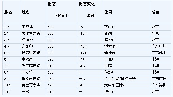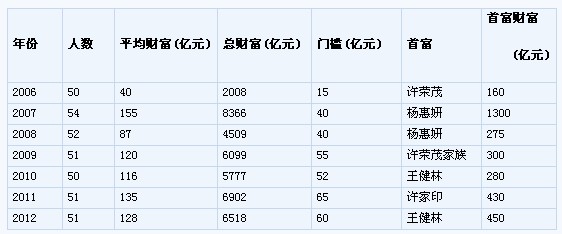 前十名總財(cái)富2770億元,平均財(cái)富252億元,2011年前十名總財(cái)富2885億元,平均財(cái)富289億元。