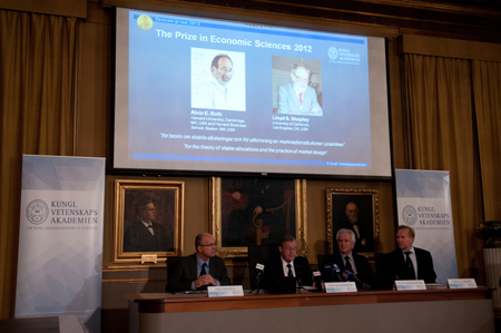 10月15日,在瑞典首都斯德哥爾摩,諾貝爾經(jīng)濟學獎揭曉儀式現(xiàn)場的幻燈片展示獲獎者、美國經(jīng)濟學家阿爾文·羅思(左)和勞埃德·沙普利的照片。 當天,瑞典皇家科學院宣布將2012年諾貝爾經(jīng)濟學獎授予美國經(jīng)濟學家阿爾文·羅思和勞埃德·沙普利。