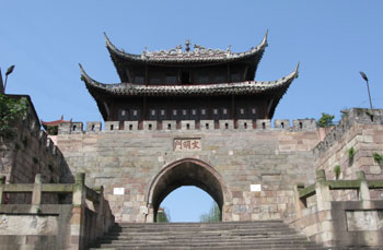 文明門城樓位于南溪城區(qū)最南端,背街臨江,地勢(shì)險(xiǎn)要。長(zhǎng)江從文明門前奔騰流過。文明門始建于明正德年間(1505-1521年),城樓矗立在6米多高的石城墻上,整座城門通高17.35、厚7.5米,門額上有知縣邵兆祿于1807年書寫的三個(gè)遒勁有力的大字“文明門”,城樓外有62級(jí)石質(zhì)臺(tái)階與碼頭相連。這里既是縣城的南大門,也是曾經(jīng)的軍事要地。