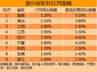 從CPI增速看,海南、湖北、江西的CPI漲幅超過1.9%的全國平均水平。其中,海南CPI同比漲幅最高,為3.2%。江蘇、四川CPI同比漲1.9%與全國水平持平。寧夏、陜西、安徽、浙江的CPI漲幅較低,其中浙江9月CPI同比增幅僅為1.4%。
