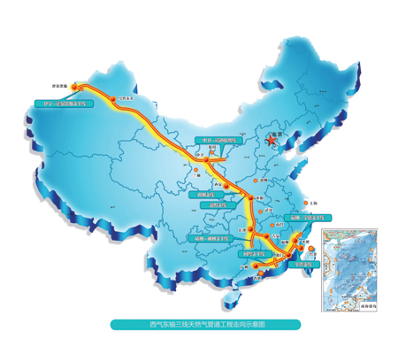 全長7378公里的西三線,設(shè)計年輸氣量達(dá)300億立方米,途經(jīng)新疆、甘肅、寧夏、陜西、河南、湖北、湖南、江西、福建、廣東10個省區(qū)。西三線建成后將使我國天然氣在一次能源消費結(jié)構(gòu)中的比例提高1至2個百分點。同時,還可每年減少二氧化碳排放1.3億噸、二氧化硫144萬噸、粉塵66萬噸、氮氧化物36萬噸。