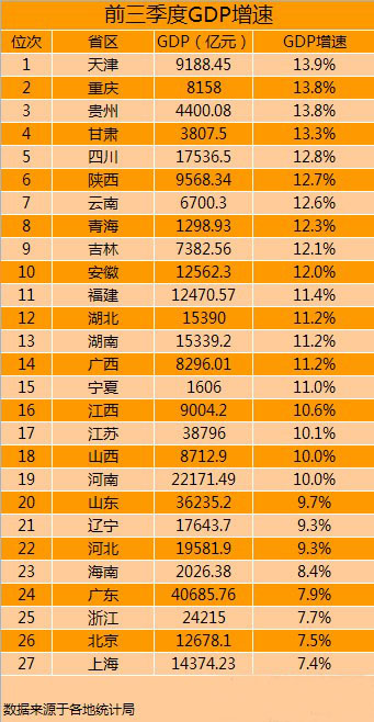 根據(jù)各地公布的數(shù)據(jù),中新網(wǎng)財經(jīng)頻道統(tǒng)計發(fā)現(xiàn),在已經(jīng)公布的這27個省份中,天津以13.9%的增速居首,重慶(13.8%)和貴州(13.8%)并列第二,而上海增速墊底,僅為7.4%。