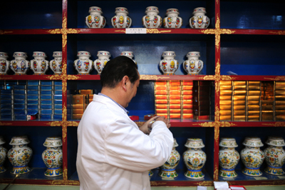 藏醫(yī)藥在甘肅省甘南藏族自治州發(fā)展已經(jīng)有1000多年的歷史。近年來,在保持藏醫(yī)藥古老傳統(tǒng)的同時,當(dāng)?shù)爻浞滞诰蜓芯坎蒯t(yī)藥在治療心腦血管疾病、消化系統(tǒng)疾病、婦科病及高原病等方面的潛力和優(yōu)勢,形成科學(xué)規(guī)范系統(tǒng)的診斷治療標(biāo)準(zhǔn)。根據(jù)甘南藏區(qū)牧民喜歡中藏藥治療的特點(diǎn),甘南及時調(diào)整了補(bǔ)償方案,降低了中藏藥起付線,提高了中藏藥的報(bào)銷比例,推行門診統(tǒng)籌。符合國家及甘肅省衛(wèi)生廳下發(fā)中藏藥目錄的藥物,參合農(nóng)牧民在各級定點(diǎn)醫(yī)療機(jī)構(gòu)住院都可實(shí)行100%全額報(bào)銷,使中藏醫(yī)藥特色服務(wù)普及全州。圖為甘肅省甘南藏族自治州藏醫(yī)藥研究院附屬醫(yī)院院長虎玉成正在藥劑室內(nèi)調(diào)配藏藥。