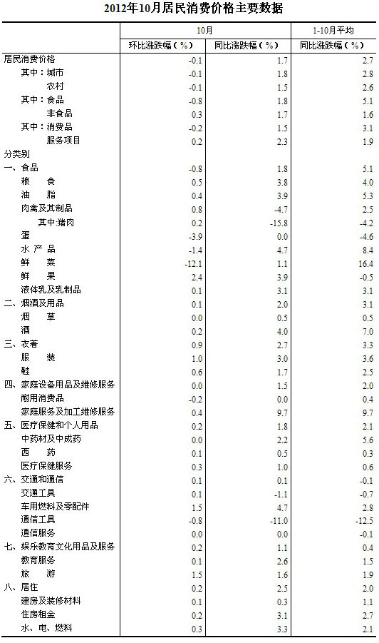 2012年10月份,全國居民消費(fèi)價(jià)格總水平同比上漲1.7%(創(chuàng)33個(gè)月以來新低)。其中,城市上漲1.8%,農(nóng)村上漲1.5%;食品價(jià)格上漲1.8%,非食品價(jià)格上漲1.7%;消費(fèi)品價(jià)格上漲1.5%,服務(wù)項(xiàng)目價(jià)格上漲2.3%。1-10月平均,全國居民消費(fèi)價(jià)格總水平比去年同期上漲2.7%。