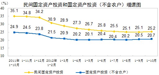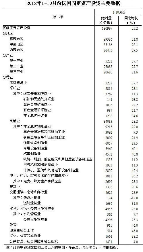 2012年1-10月份,全國(guó)民間固定資產(chǎn)投資180997億元,同比名義增長(zhǎng)25.2%,增速比1-9月份加快0.1個(gè)百分點(diǎn)。民間固定資產(chǎn)投資占固定資產(chǎn)投資的比重為61.9%,比1-9月份下降0.1個(gè)百分點(diǎn)。
