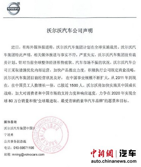 日前據(jù)瑞典《每日工業(yè)報(bào)》報(bào)道,為縮減開(kāi)支,吉利汽車(chē)旗下沃爾沃轎車(chē)公司正計(jì)劃進(jìn)一步裁員;此次裁員計(jì)劃將波及公司2.2萬(wàn)名全職員工和3500名外聘咨詢(xún)師。報(bào)道中稱(chēng),此前該公司已經(jīng)在英國(guó)、比利時(shí)和巴西等多國(guó)工廠(chǎng)宣布多項(xiàng)裁員計(jì)劃。消息傳出后,沃爾沃汽車(chē)集團(tuán)向中新網(wǎng)汽車(chē)頻道發(fā)來(lái)聲明,否認(rèn)其有裁員打算。沃爾沃汽車(chē)集團(tuán)中國(guó)區(qū)公共事務(wù)副總裁寧述勇在聲明中稱(chēng),有關(guān)沃爾沃計(jì)劃在全球?qū)嵤┎脝T的相關(guān)媒體報(bào)道與事實(shí)不符,沃爾沃汽車(chē)集團(tuán)沒(méi)有裁員計(jì)劃。