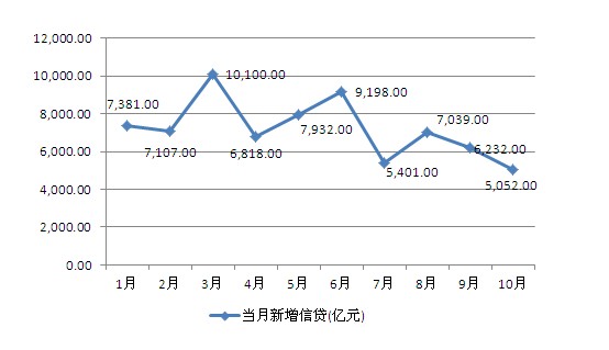 央行2012年11月12日公布社會(huì)融資規(guī)模數(shù)據(jù),數(shù)據(jù)顯示10月人民幣信貸增加5052億元,創(chuàng)下了自2011年10月以來(lái)13個(gè)月新低,同比少增816億元。