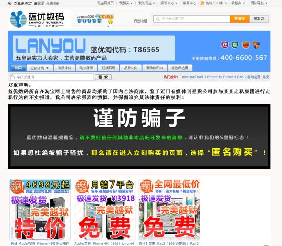 圖為淘寶藍(lán)優(yōu)數(shù)碼網(wǎng)店截圖,藍(lán)優(yōu)數(shù)碼因涉嫌走私5億元iPhone,2012年被警方查處,涉案25人近日在深圳中院出庭受審。