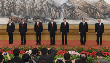 人民大會堂東大廳鮮花盛開,暖意融融,氣氛莊重而熱烈。500多名中外記者早早來到這里等候,準備爭搶在第一時間報道新一屆中共最高領(lǐng)導(dǎo)層的首次集體公開亮相。