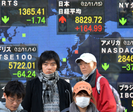 11月15日,東京股市高開高走,收盤時日經225種股票平均價格指數(shù)比前一個交易日大漲1.90%,報8829.72點。日本首相野田佳彥14日宣布將于16日解散眾議院。若大選后誕生以自民黨為中心的新政權,預計新政府將采取激進的貨幣寬松政策及財政支出來刺激經濟復蘇,受此提振,當日早盤日經股指上漲0.96%! 圖為15日,在日本首都東京,行人經過電子股指顯示牌。