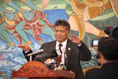 11月18日,在柬埔寨首都金邊,東盟秘書長(zhǎng)素林在新聞發(fā)布會(huì)上講話。素林表示,盡管面臨諸多挑戰(zhàn),東盟領(lǐng)導(dǎo)人普遍認(rèn)為東盟一體化進(jìn)程進(jìn)展順暢,有信心在2015年建成東盟經(jīng)濟(jì)共同體。當(dāng)日,第21屆東盟峰會(huì)在柬埔寨首都金邊開幕。與會(huì)東盟領(lǐng)導(dǎo)人將重點(diǎn)討論深化區(qū)域合作、推進(jìn)區(qū)域一體化進(jìn)程、世界經(jīng)濟(jì)恢復(fù)乏力帶來的諸多全球性挑戰(zhàn)等重大問題。