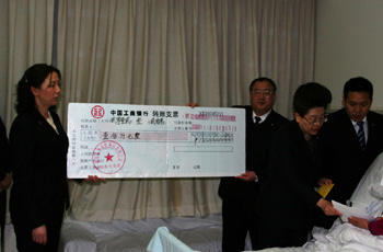 客戶尚先生于2008年10月在新華保險先后投保了福如東海A款終身壽險,附加提前給付重大疾病保險A款以及吉利相伴A款兩全保險。今年3月,尚先生被確診為結腸癌晚期,病情危重隨時危及生命。得知這一情況后,新華保險積極組織理賠工作,迅速啟動理賠綠色通道。3月23日晚,全國勞動模范、新華保險功勛總監(jiān)、海淀聯(lián)合營業(yè)區(qū)總經(jīng)理金愛麗親自將提前給付的福如東海A款終身壽險,附加提前給付重大疾病保險A款100萬元大額理賠金送到正在接受治療的尚先生手中。