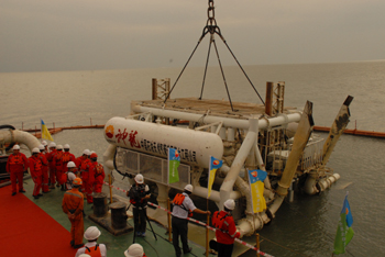在西氣東輸二線深圳-香港支線海底管道項(xiàng)目施工現(xiàn)場,由管道局與國內(nèi)知名科研單位共同研發(fā)的“神龍?zhí)枴贝罂趶胶笸跍蠙C(jī)浮出水面,標(biāo)志著深圳-香港海底管道后挖溝工程順利竣工。記者