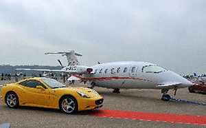 圖為中美歐亞公司展出的一款通用航空飛機,與之相伴的是頂級跑車,這似乎暗示著其產(chǎn)品的市場定位。 |