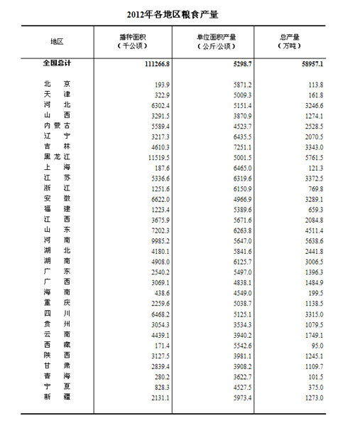 國(guó)家統(tǒng)計(jì)局關(guān)于2012年糧食產(chǎn)量數(shù)據(jù)的公告