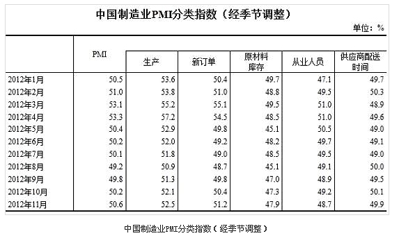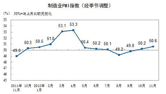 2012年11月,中國制造業(yè)采購經(jīng)理指數(shù)(PMI)為50.6%,比上月上升0.4個百分點。