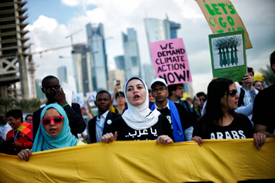 圖為多哈氣候大會(huì)會(huì)場外,示威者呼吁發(fā)達(dá)國家盡快采取行動(dòng)應(yīng)對氣候變化。