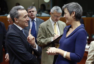 圖為意大利財(cái)長(zhǎng)格雷利(左)和丹麥經(jīng)濟(jì)大臣韋斯塔格在會(huì)議期間交談。