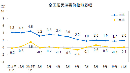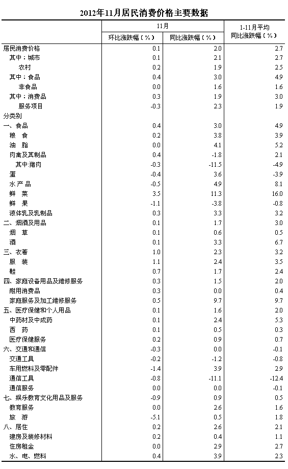 2012年11月份,全國居民消費價格總水平同比上漲2.0%。其中,城市上漲2.1%,農(nóng)村上漲1.9%;食品價格上漲3.0%,非食品價格上漲1.6%;消費品價格上漲1.9%,服務(wù)項目價格上漲2.3%。1-11月平均,全國居民消費價格總水平比去年同期上漲2.7%。