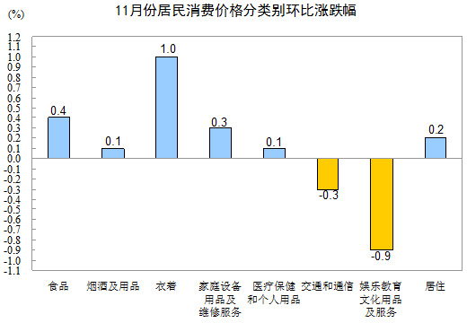 11月份,非食品價格環(huán)比持平。其中,衣著價格上漲1.0%,家庭設(shè)備用品及維修服務(wù)價格上漲0.3%,居住價格上漲0.2%,煙酒及用品、醫(yī)療保健和個人用品價格均上漲0.1%,娛樂教育文化用品及服務(wù)價格下降0.9%,交通和通信價格下降0.3%。居住中,水、電、燃料價格上漲0.4%。