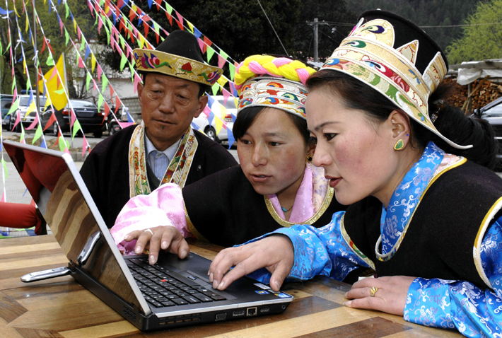 西藏林芝縣唐地村村民通過(guò)互聯(lián)網(wǎng)瀏覽新聞。 新華社 李偉明/攝 |