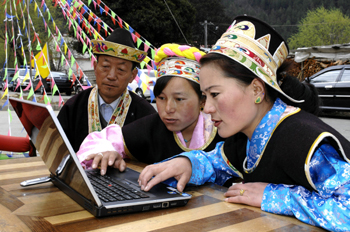 西藏林芝縣唐地村村民通過互聯(lián)網(wǎng)瀏覽新聞。新華社發(fā)(李偉明/攝) |