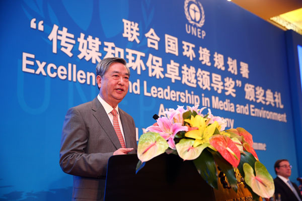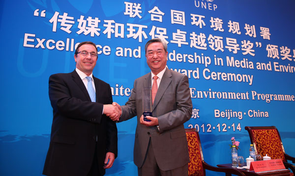 聯(lián)合國環(huán)境規(guī)劃署14日在北京舉行“傳媒和環(huán)保卓越領(lǐng)導(dǎo)獎”頒獎典禮。新華社社長李從軍因?yàn)閷θ颦h(huán)保事業(yè)的努力,成為這一獎項(xiàng)的首位得主。