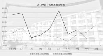 根據(jù)財(cái)政部公布的數(shù)據(jù),從2012年的整體財(cái)政收入情況來(lái)看,1至11月累計(jì)全國(guó)財(cái)政收入108903億元,比去年同期增加11594億元,增長(zhǎng)11.9%?傮w看,今年財(cái)政收入增幅比去年同期明顯回落,1月至11月全國(guó)財(cái)政收入累計(jì)增幅比去年同期回落14.9個(gè)百分點(diǎn)。