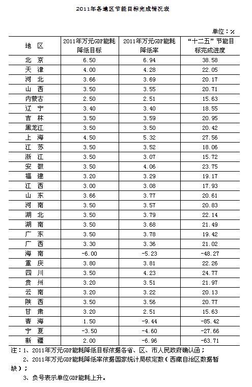 超額完成的地區(qū)有北京、天津、河北、山西、上海、山東、河南、湖北、四川、貴州10個省(市);完成的地區(qū)有吉林、黑龍江、安徽、湖南、廣西、重慶、云南、陜西8個省(區(qū)、市);完成了年度節(jié)能目標(biāo)但落后于“十二五”節(jié)能目標(biāo)進度的地區(qū)有內(nèi)蒙古、遼寧、江蘇、福建、江西、廣東6個省(區(qū));未完成的地區(qū)有浙江、海南、甘肅、青海、寧夏、新疆6個省(區(qū)),其中青海因玉樹地震災(zāi)害的影響未完成年度節(jié)能目標(biāo)。