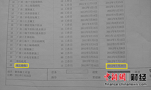 在康保中國向記者提供的《廠房一等四項工程整體施工進度計劃》中可以看到,工程開始時間為2011年7月28日,應(yīng)竣工時間為2012年7月26日。以2012年12月26日為節(jié)點,工程已經(jīng)拖延5個月。