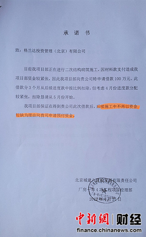 針對由于后面工程有利潤所以甲方不想讓北京城建八做的說法,康保中國投資總監(jiān)張立對中新網(wǎng)財經(jīng)頻道說:“真正的原因是北京城建八的項(xiàng)目部沒有能力(掛靠公司)、信譽(yù)和資金完成后續(xù)項(xiàng)目,北京城建八兩次向格蘭達(dá)投資借款:第一次為100萬元;第二次為200萬元。第一次借款格蘭達(dá)投資借了;第二次由于工期延誤,格蘭達(dá)投資同意借款,但前提條件是請乙方承諾完工時間和工地移交時間以及專款專用,由于城建八無法承諾,所以雙方未就此事達(dá)成一致。后續(xù)工程由于乙方?jīng)]有施工組織能力和沒有資金購買材料而無法施工。從9月份起,現(xiàn)場施工人員嚴(yán)重不足,現(xiàn)場基本沒有管理,在格蘭達(dá)投資多次催促下,現(xiàn)場還沒有任何改善,這是工程沒法完成的真實(shí)原因。關(guān)于材料備料款根據(jù)雙方約定格蘭達(dá)投資不需要支付乙方材料備料款,另外格蘭達(dá)投資已經(jīng)足額支付了安全文明施工費(fèi)!