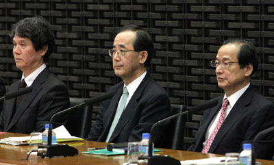 日本央行行長白川方明(中)15日在分行行長季度會議上說,央行將通過維持利率零水平以及穩(wěn)步擴大資產購買計劃,來持續(xù)放松銀根。他表示,盡快克服通縮對于日本經濟至關重要。