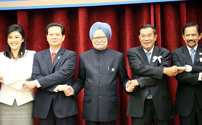 印度總理辛格在東盟-印度(10+1)領(lǐng)導(dǎo)人會(huì)議上與東盟領(lǐng)導(dǎo)人合影。記者 李鵬 攝 |