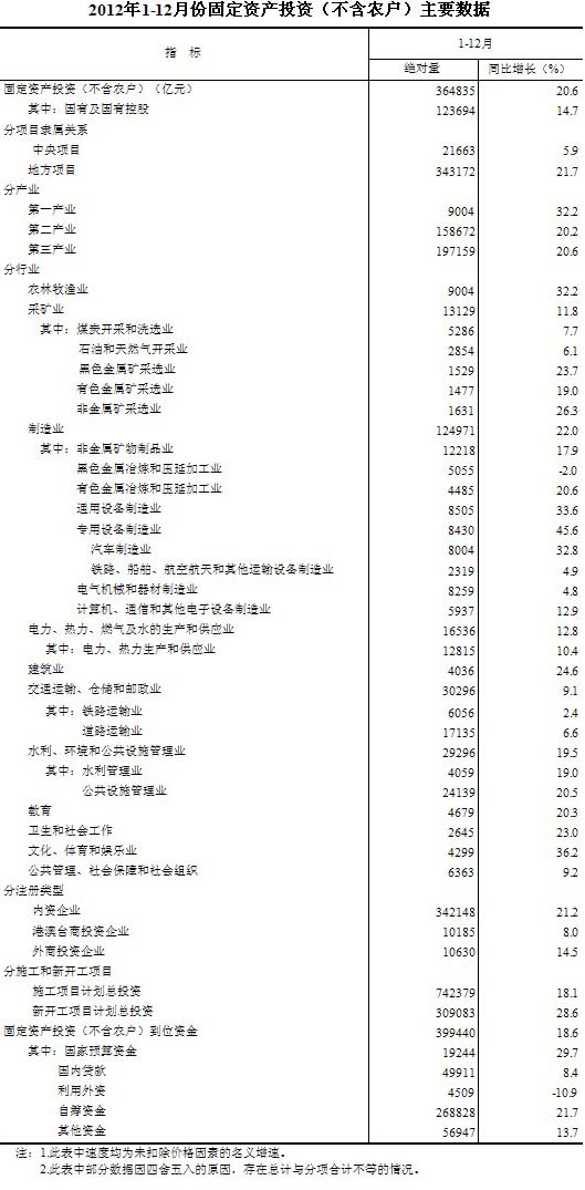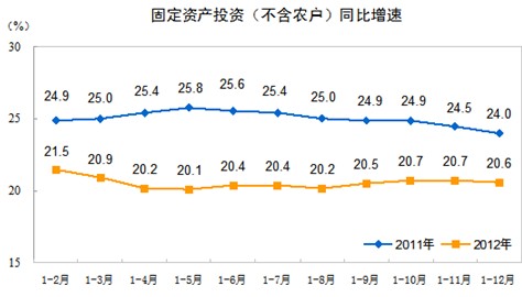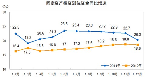 2012年1-12月份,全國固定資產(chǎn)投資(不含農(nóng)戶)364835億元,同比名義增長20.6%(扣除價格因素實際增長19.3%),增速比1-11月份回落0.1個百分點,比2011年回落3.4個百分點。從環(huán)比看,12月份固定資產(chǎn)投資(不含農(nóng)戶)增長1.53%。