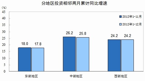 分地區(qū)看,1-12月份,東部地區(qū)投資169939億元,同比增長17.8%,增速比1-11月份回落0.2個百分點;中部地區(qū)投資103713億元,增長25.8%,增速回落0.4個百分點;西部地區(qū)投資86150億元,增長24.2%,增速與1-11月份持平。