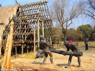 河姆渡遺址位于余姚市河姆渡鎮(zhèn)金吾廟村。它是1973年夏天當(dāng)?shù)剞r(nóng)民建造排澇站時(shí)發(fā)現(xiàn)的,總面積約4萬平方米,自下而上疊壓著4個(gè)文化層,根據(jù)北京大學(xué)碳14實(shí)驗(yàn)室測(cè)定,第四文化層距今約7000-6500年,第三文化層距今約6500-6000年,第二文化層距今約6000-5500年,第一文化層距今約5500-5000年。該遺址于1973年和1977年冬進(jìn)行過兩次考古發(fā)掘,合計(jì)面積2630平方米,出土生產(chǎn)工具、生活器具、原始藝術(shù)品等文物6700余件,還發(fā)現(xiàn)豐富的栽培稻谷和大面積的木建筑遺跡、捕獵的野生動(dòng)物和家養(yǎng)動(dòng)物的骨骸、采集的植物果實(shí)及少量的墓葬等遺存。所有這些,為研究中國遠(yuǎn)古時(shí)代的農(nóng)業(yè)、建筑、制陶、紡織、藝術(shù)和東方文明的起源以及古地理、古氣候、古水文的演變提供了極其珍貴的實(shí)物資料。河姆渡遺址第一、第二文化層的出土文物與浙江省內(nèi)湖州邱城遺址下層及嘉興市郊馬家濱遺址的器物相似,第三、第四文化層的出土文物,在浙江則是新發(fā)現(xiàn),而且它已擁有較為發(fā)達(dá)的耜耕農(nóng)業(yè)、采用榫卯技術(shù)的干欄式建筑,在國內(nèi)同時(shí)代的遺址中,它的生產(chǎn)、生活水平處于領(lǐng)先地位,因此是一支全新的考古學(xué)文化,故命名為河姆渡文化!