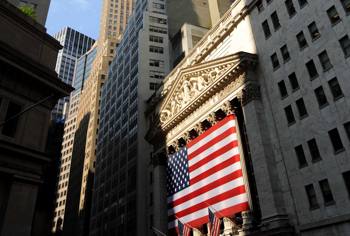 在美國(guó)紐約華爾街,華盛頓雕像的手臂指向晨光中的紐約證券交易所。記者 申宏/攝 |