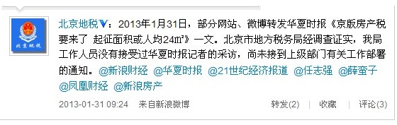 北京市地方稅務局發(fā)表官方微博稱,“2013年1月31日,部分網(wǎng)站、微博轉發(fā)華夏時報《京版房產稅要來了起征面積或人均24㎡》一文。北京市地方稅務局經調查證實,我局工作人員沒有接受過華夏時報記者的采訪,尚未接到上級部門有關工作部署的通知!