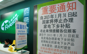 南京市某電器賣(mài)場(chǎng) 1月31日貼出告示,提醒消費(fèi)者家電下鄉(xiāng)政策到期。(實(shí)習(xí)記者 李響
