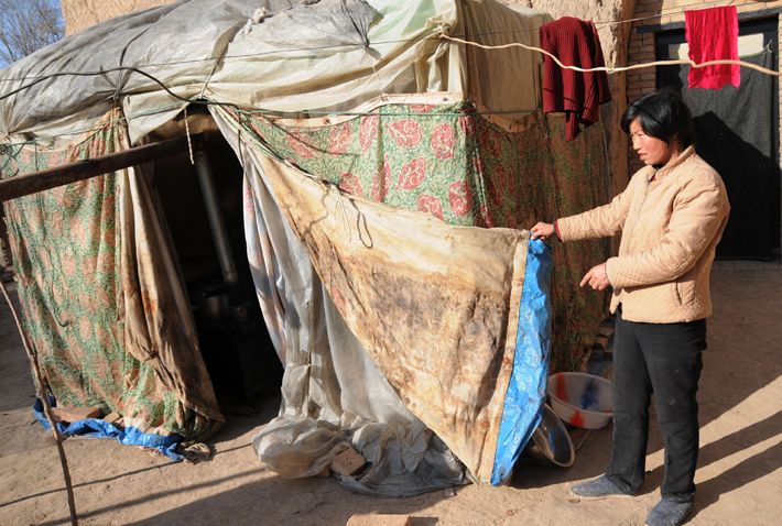 由于擔(dān)心危窯坍塌,常小萍和丈夫在院子里用塑料、破布搭了一大一小兩頂簡易帳篷,在慶陽市政府除夕發(fā)放救災(zāi)帳篷之前,常小萍夫婦已經(jīng)在里面住了一個多月。