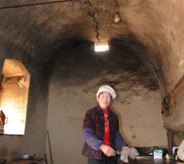 | 鎮(zhèn)原縣平泉鎮(zhèn)麻王村村民張清芳在自家廚窯里收拾案板,她頭頂窯背上一條長長的裂縫是石油勘探放炮時震出的。 |